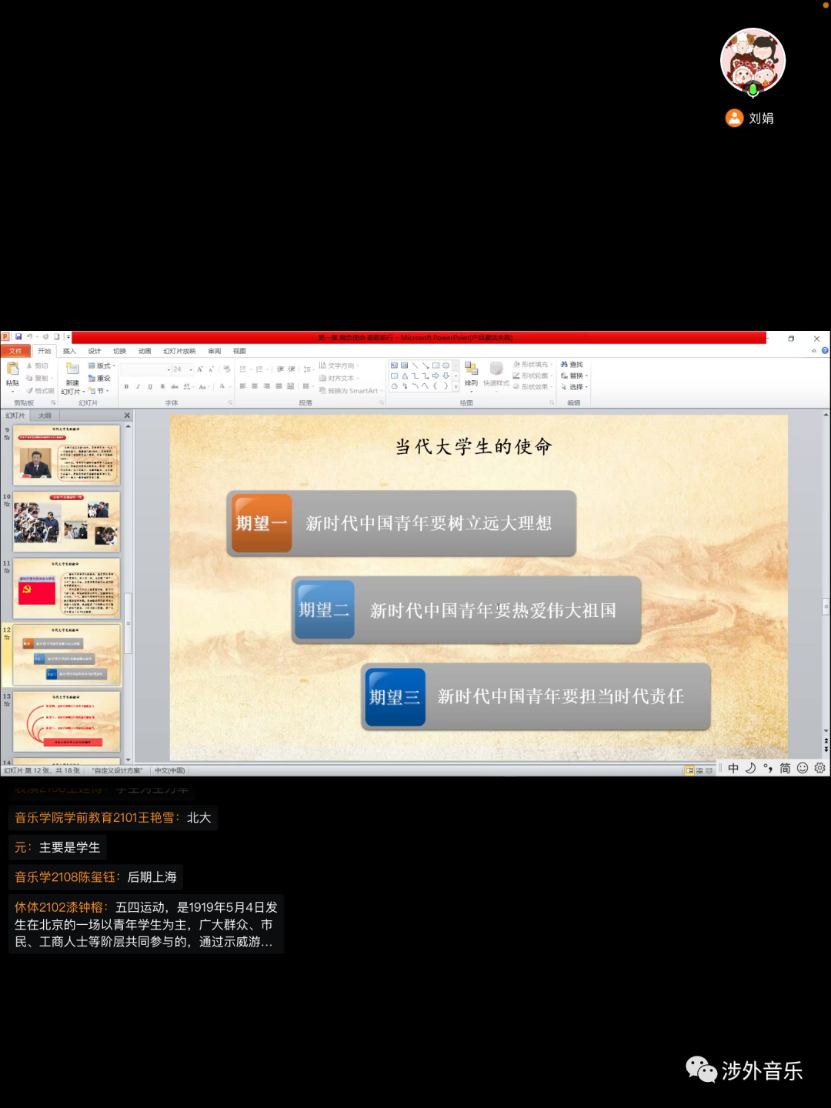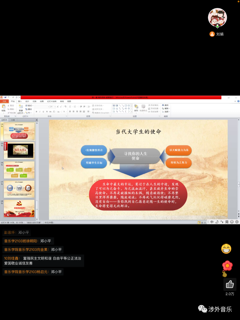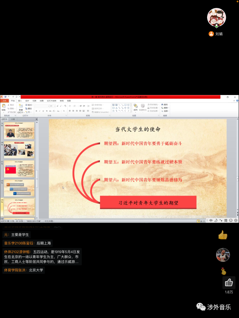 老师讲述了当代大学生的三大使命,随后讲解了习近平在纪念五四运动100周年大会上的重要讲话,提出五四运动后,是中国青年一代又一代的奋斗前行的100年,是中国青年创造青春中国,青春民族的100年,我们作为新一代青年大学生需要明白自己的使命,牢记五四运动的历史故事!并向我们提出社会主义核心价值观是什么,随后讲解到社会主义核心价值观分成三大部分。同时讲述习近平对青年大学生的六大期望: