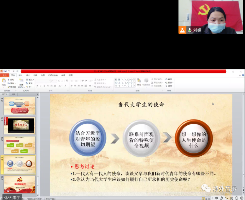 生命中最大的幸运,莫过于在人生的中途,发现了可以为之奋斗、为之流血流汗,甚至放弃生命的崇高使命。当我们找到了自己愿意追随一生的使命时,生命将变得无比鲜活!之后老师给我们观看了《红色故事汇》,内容真实感人,是老一辈人体现个人价值的见证,是他们实现自我使命的体现!
