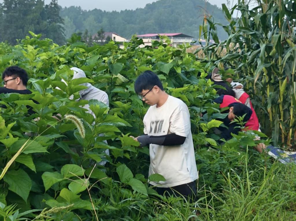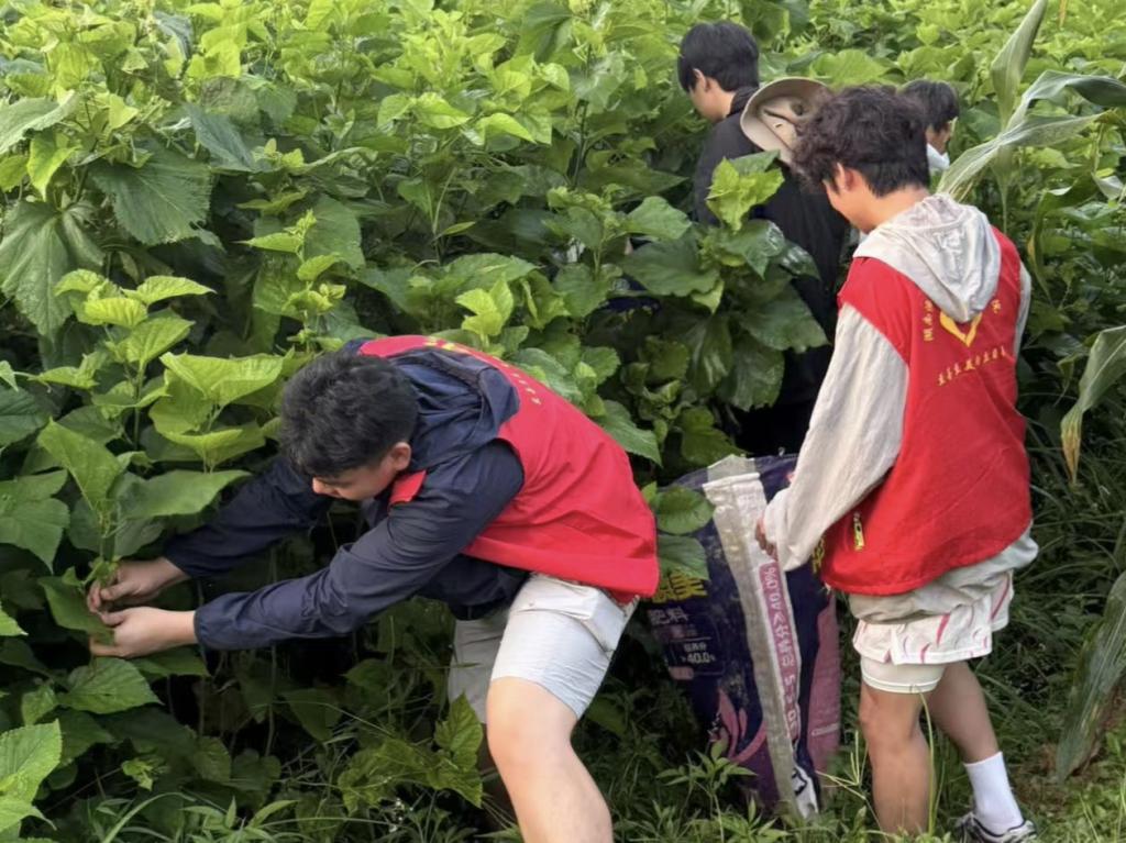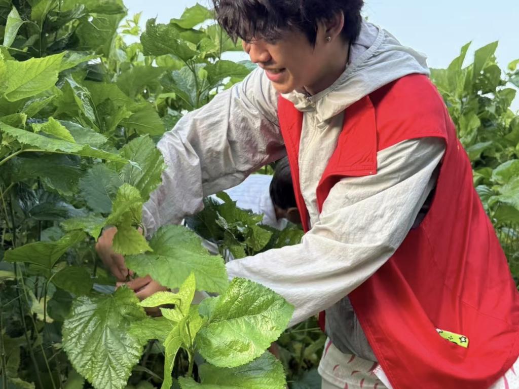 起初还有些手生的同学们,很快就找到了节奏。大家三人一组、五人一队,穿梭在桑田垄间,指尖与桑叶轻触的瞬间,仿佛奏响了一曲独特的“田园交响乐”——这旋律里,有叶片簌簌的轻响,有伙伴们的欢声笑语,更有青年学子躬身实践的赤诚。
