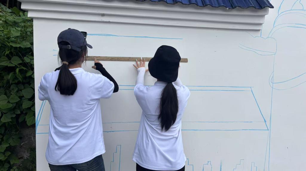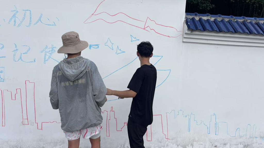 “调色就像和声,冷暖搭配才和谐!”学作曲的同学一边调配颜料,一边和伙伴分享心得。画笔在墙面上舞动,原本单调的灰色围墙渐渐变得色彩斑斓,路过的村民忍不住驻足称赞:“这画一上,基地看着都年轻了!”颜料蹭到了袖口,汗水浸湿了后背,但看着亲手绘制的画面一点点成型,大家的脸上都洋溢着成就感。